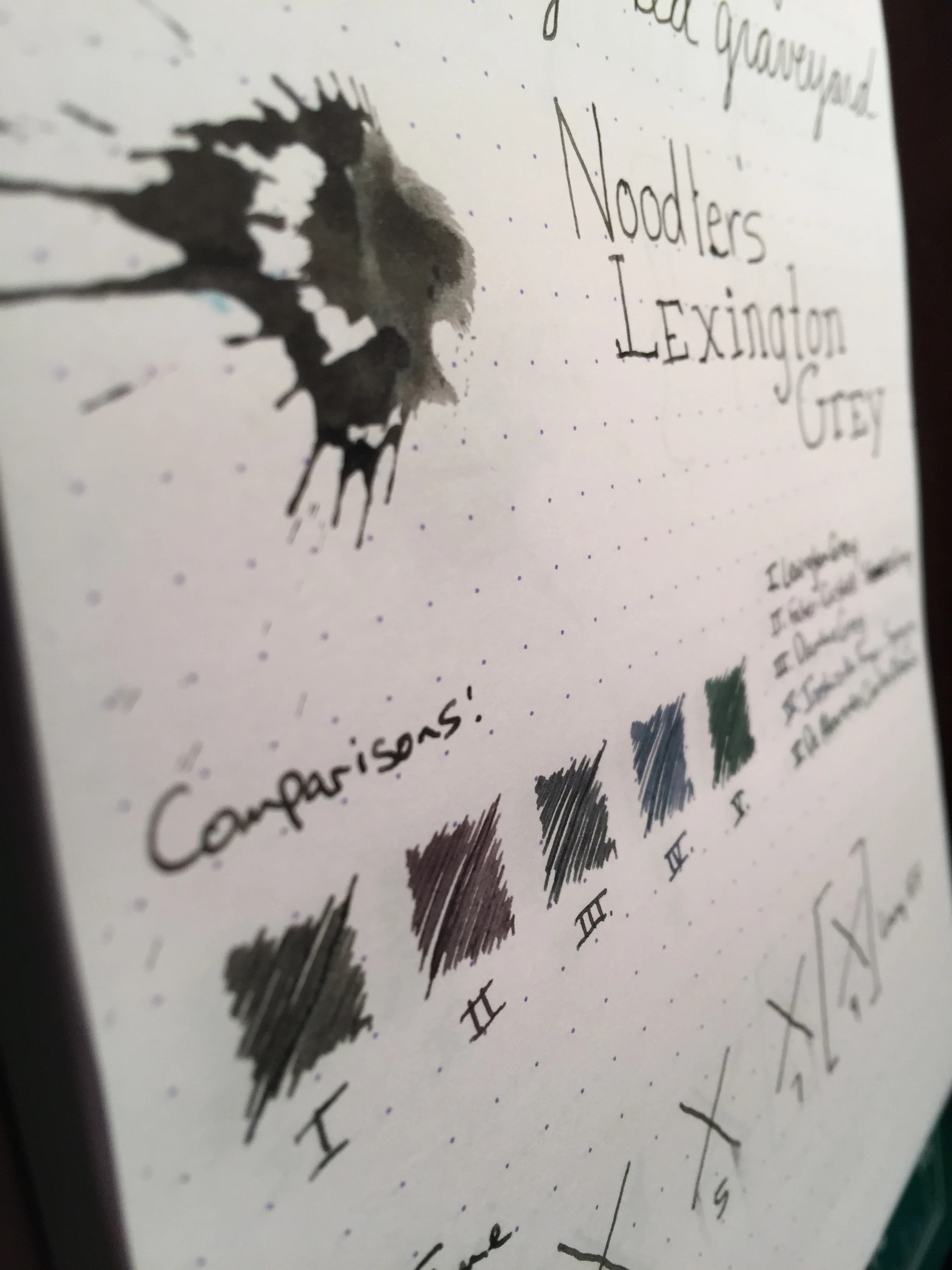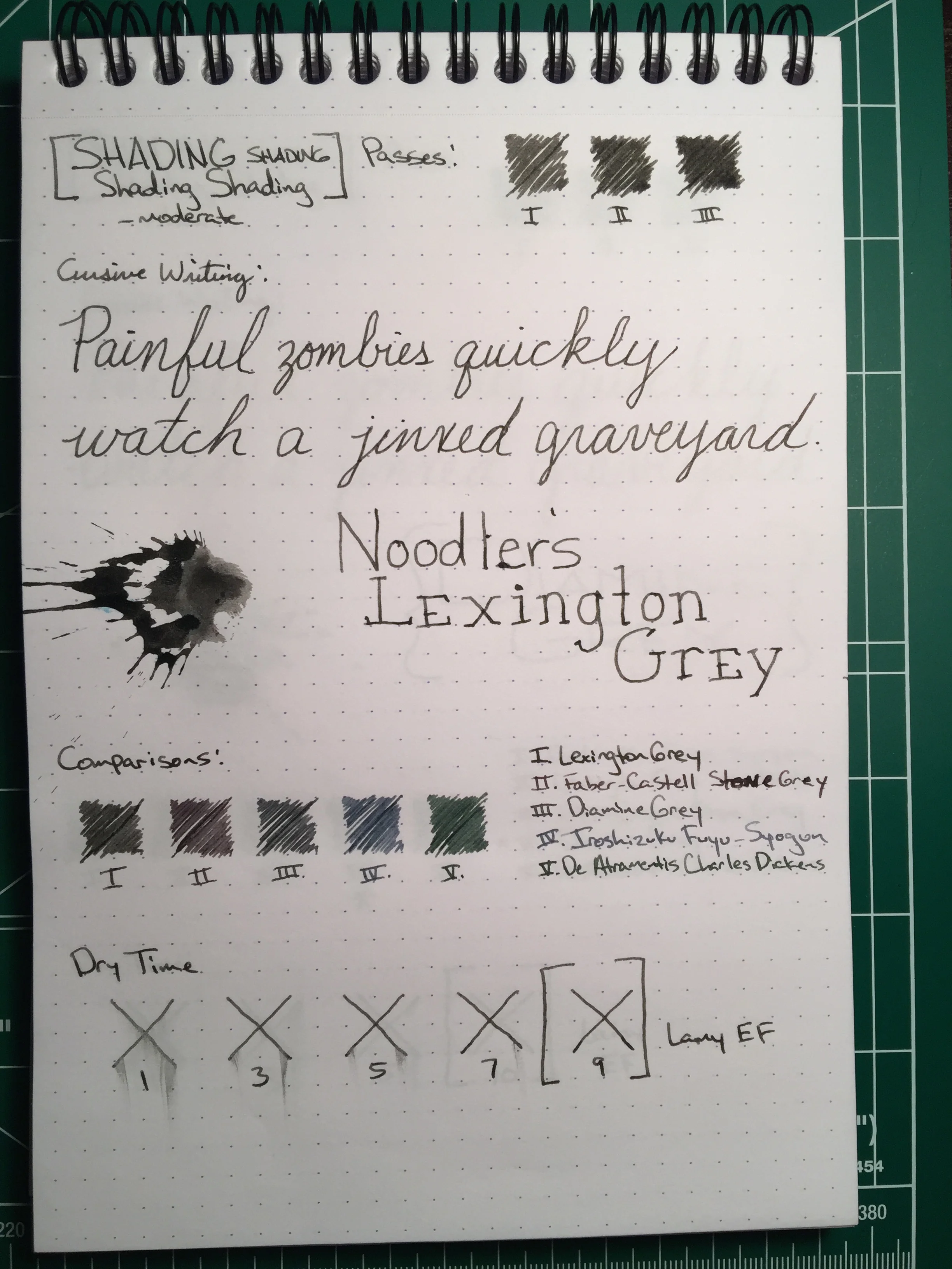 Diamine Grey, like most other Diamine inks, is well behaved in all aspects. It does not feather, bleed or ghost. Dry time is a bit on the long side at 10 seconds for my EF nib. I love that this is a true grey and really no hint of another color exhibits itself. I do notice a faint red sheet on the ink splatter, though you don't see it with normal writing.